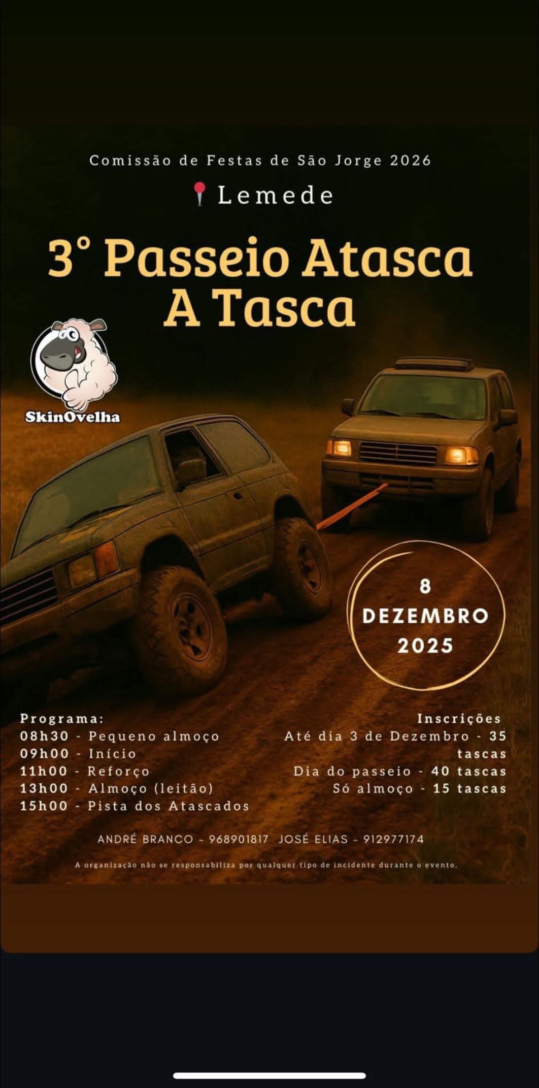 Lemede Lemede, Cantanhede, Coimbra, PortugalSports & GamesINSCRIÇÕES ABERTAS !!A comissão de festas vem por este meio convidar a todos os amantes de todo o terreno a participar no nosso 3ºpasseio de TT " ATASCA A TASCA" no dia 8 de Dezembro.Marquem já na vossa agenda e não se esqueçam que estão todos convidados, mesmo quem não tenha jipe, todos serão muito… Read More »3° Passeio Atasca A Tasca – Lemede