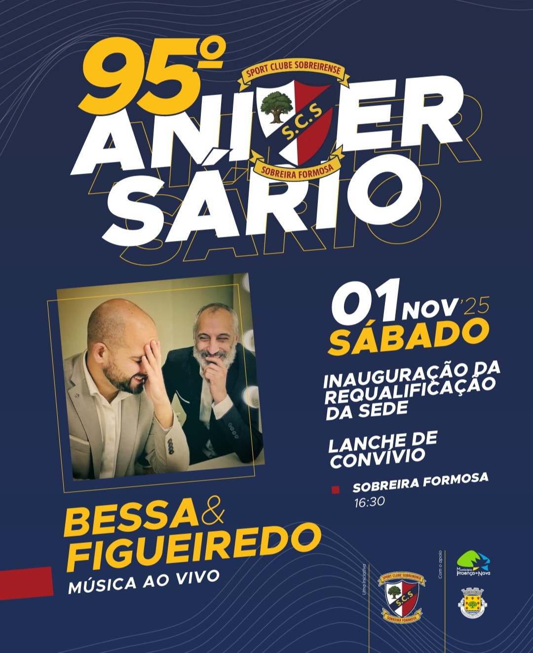 Sobreira Formosa Sobreira Formosa, Castelo Branco, PortugalCommunity𝟗𝟓.º 𝐀𝐧𝐢𝐯𝐞𝐫𝐬𝐚𝐫𝐢𝐨 𝐝𝐨 𝐒𝐩𝐨𝐫𝐭 𝐂𝐥𝐮𝐛𝐞 𝐒𝐨𝐛𝐫𝐞𝐢𝐫𝐞𝐧𝐬𝐞 | 01 de novembro de 2025 O Sport Clube Sobreirense celebra com orgulho o seu 95.º aniversário e 𝐜𝐨𝐧𝐯𝐢𝐝𝐚 𝐭𝐨𝐝𝐨𝐬 𝐨𝐬 𝐬𝐨𝐜𝐢𝐨𝐬 𝐞 𝐚 𝐜𝐨𝐦𝐮𝐧𝐢𝐝𝐚𝐝𝐞 a participar neste dia tão especial, em Sobreira Formosa! A data marca também a 𝐢𝐧𝐚𝐮𝐠𝐮𝐫𝐚𝐜ã𝐨 𝐝𝐚 𝐫𝐞𝐪𝐮𝐚𝐥𝐢𝐟𝐢𝐜𝐚𝐜ã𝐨 𝐝𝐚 𝐬𝐞𝐝𝐞 𝐝𝐨 𝐜𝐥𝐮𝐛𝐞, um momento simbólico… Read More »95° Aniversario do Sporte Clube Sobreirense – Sobreira Formosa