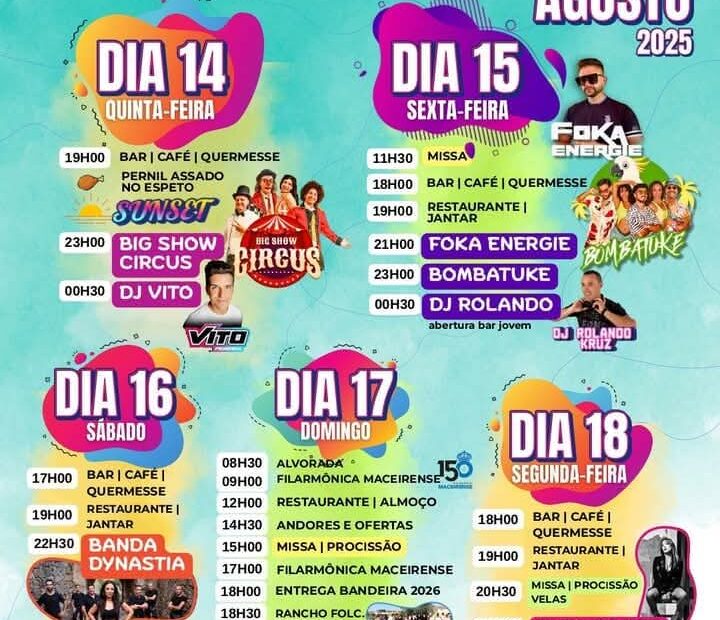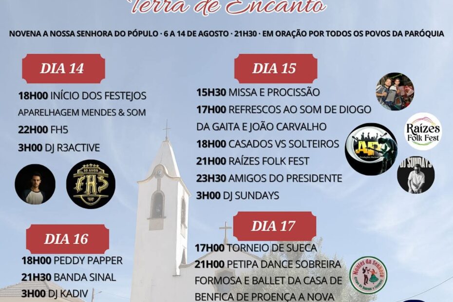 Montes da Senhora em Festa! De 14 a 17 de agosto de 2025, a animação está garantida com 4 dias cheios de música, tradição e convívio! Concertos, DJs, baile, folclore, desporto, animação para todas as… Read More »Festa em honra de Nossa Senhora do Pópulo – Montes da Senhora